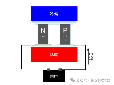 O princípio do resfriamento de semicondutores (efeito Peltier): quando a corrente passa pela superfície de contato entre materiais semicondutores tipo p e tipo n, os portadores migram e absorvem calor para obter resfriamento (extremidade fria), enquanto o calor é liberado no outro lado (extremidade quente)